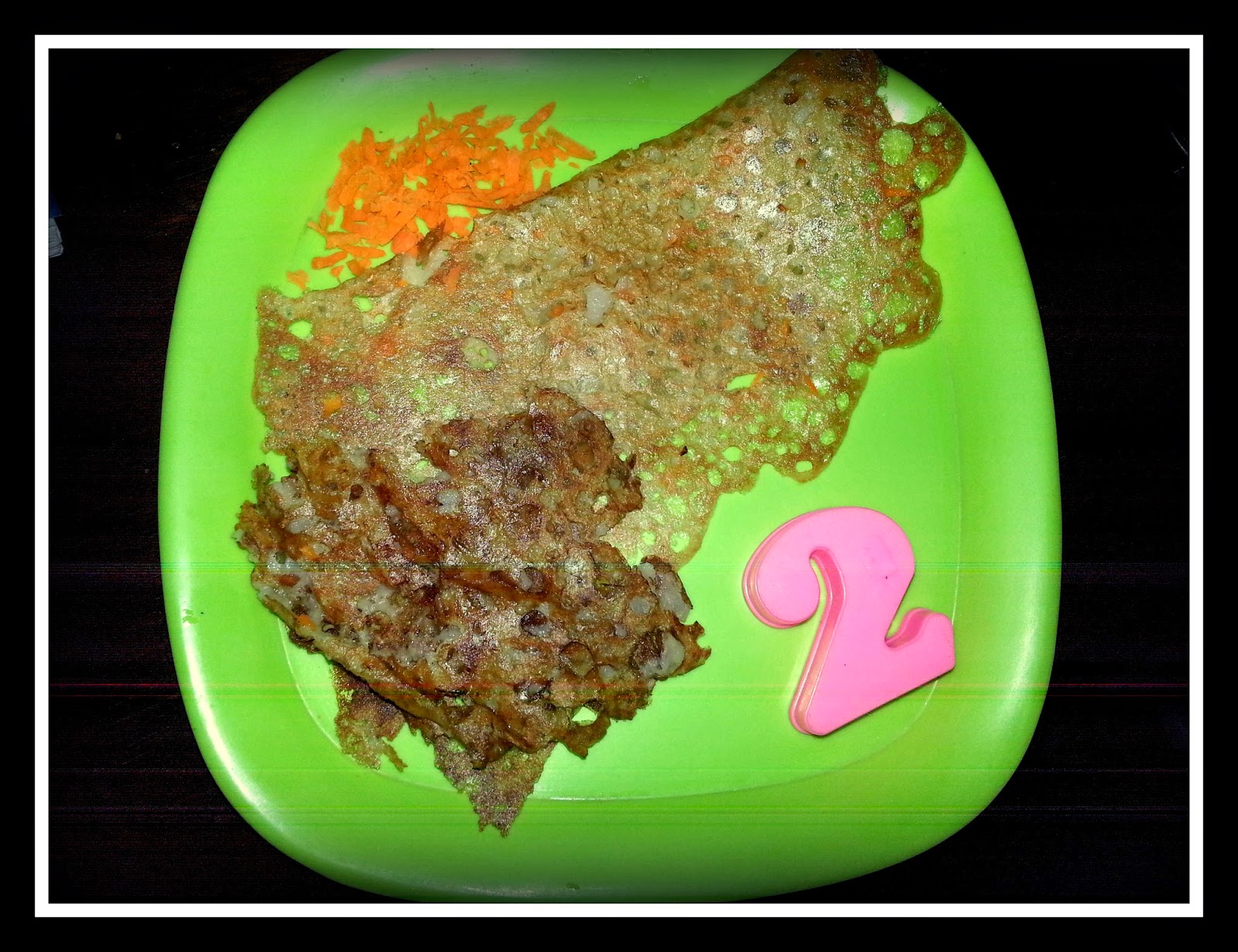 Mom is tired and down with cold since a week and as she doesn't take medicine it is even more tiring to run behind me. I didn't eat food last night and ate some nice snacks which were not filling enough. Dad takes me on his shoulder and goes for walks around the house to lull me to sleep and I love it. I suddenly got up today and was hungry at 2 AM and  was cranky. Mom understood what I wanted and prepared these mini dosas for me at 2 AM and this wonderful little dal for me to have now. I loved it when she was singing to me while making me all these and I was cranky and resting on dad's shoulder. She has amazing patience and loves me a lot.